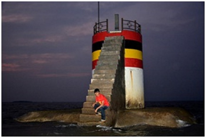 Đến đê Tràng Vỹ và sau nửa giờ đò máy, bạn sẽ ra đến cột mốc tròn to có 3 vạch sơn đen, vàng, đỏ trên nền trắng. Đứng đây, bạn