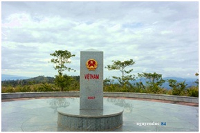 Cột mốc làm bằng đá hoa cương, đặt trên đỉnh núi có độ cao 1.086 m so với mực nước biển, là một trong hai cột mốc biên giới ghi danh ba quốc gia của nước ta. Có hình trụ tam giác, mỗi mặt quay về hướng quốc gia đó có tên nước và quốc huy trang trọng.