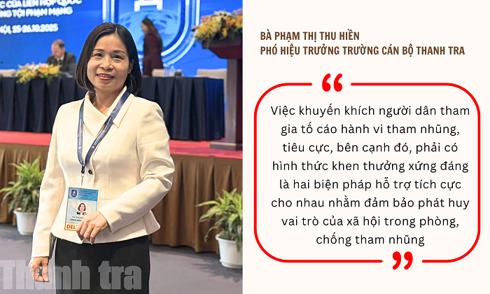 Theo bà Phạm Thị Thu Hiền, Phó Hiệu trưởng Trường Cán bộ Thanh tra, khen thưởng người tố cáo không chỉ là câu chuyện động viên tinh thần, mà là công cụ pháp lý để khích lệ xã hội cùng tham gia kiểm soát quyền lực, phòng ngừa tiêu cực.