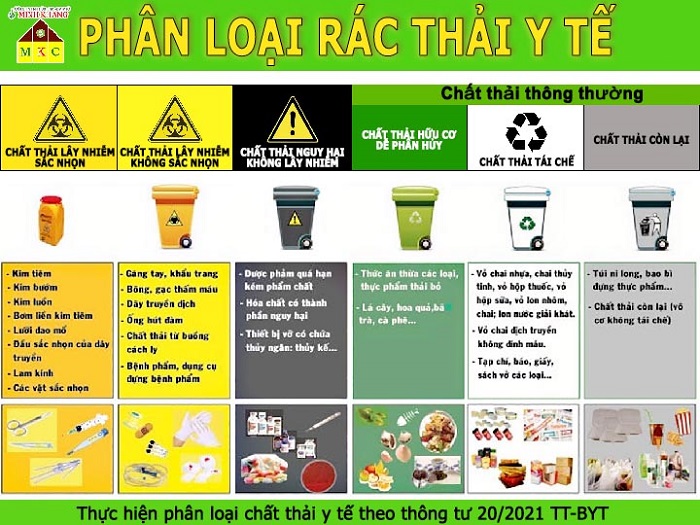 Thông tư 20/2021/TT-BYT cũng quy định về thiết bị, dụng cụ chứa rác thải y tế. Để dễ dàng phân biệt, nhóm rác y tế được phân loại sẽ đi theo màu sắc thiết bị cố định để phân tách và có hướng dẫn trực tiếp ngay tại vị trí đặt gồm: Màu vàng dùng cho chất thải lây nhiễm nguy hại; Màu đen dùng cho chất thải nguy hại không lây nhiễm, độc tế bào; Màu xanh dùng cho chất thải rắn thông thường; Màu trắng dùng cho chất thải thông thường khác có thể tái chế.