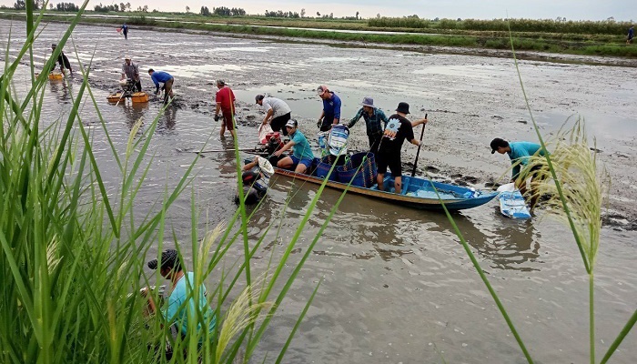 Người dân huyện Hồng Dân (tỉnh Bạc Liêu cũ) thu hoạch tôm trên nền đất lúa. Ảnh: Chanh Đa/TTXVN